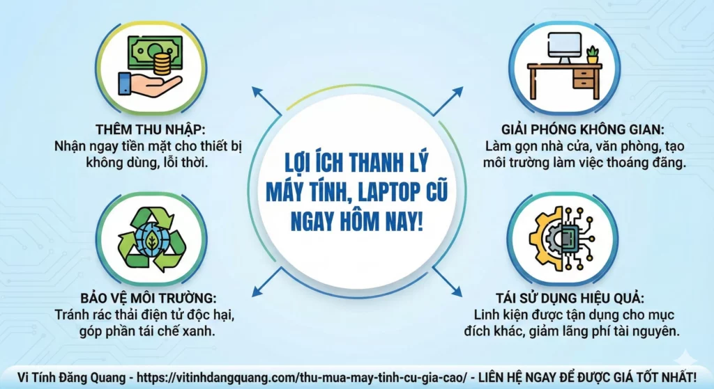 Trước khi đi sâu vào dịch vụ của chúng tôi, hãy cùng nhìn nhận lại những lợi ích thiết thực khi bạn quyết định thanh lý những thiết bị công nghệ đã cũ.